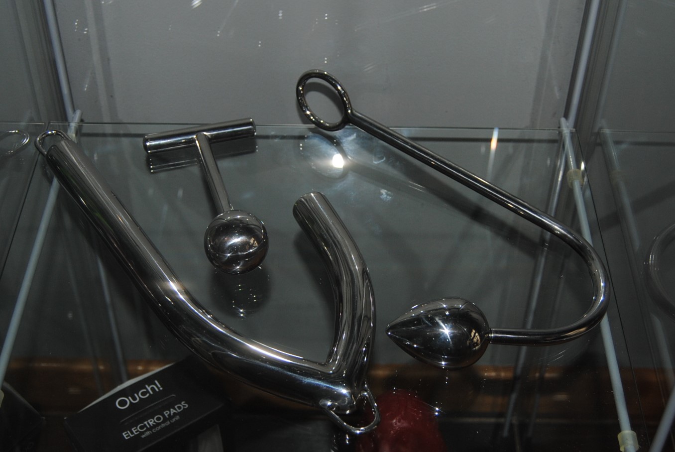 Vitrines com acessórios para medical play. Lubrificante, luvas e preservativos à disposição.